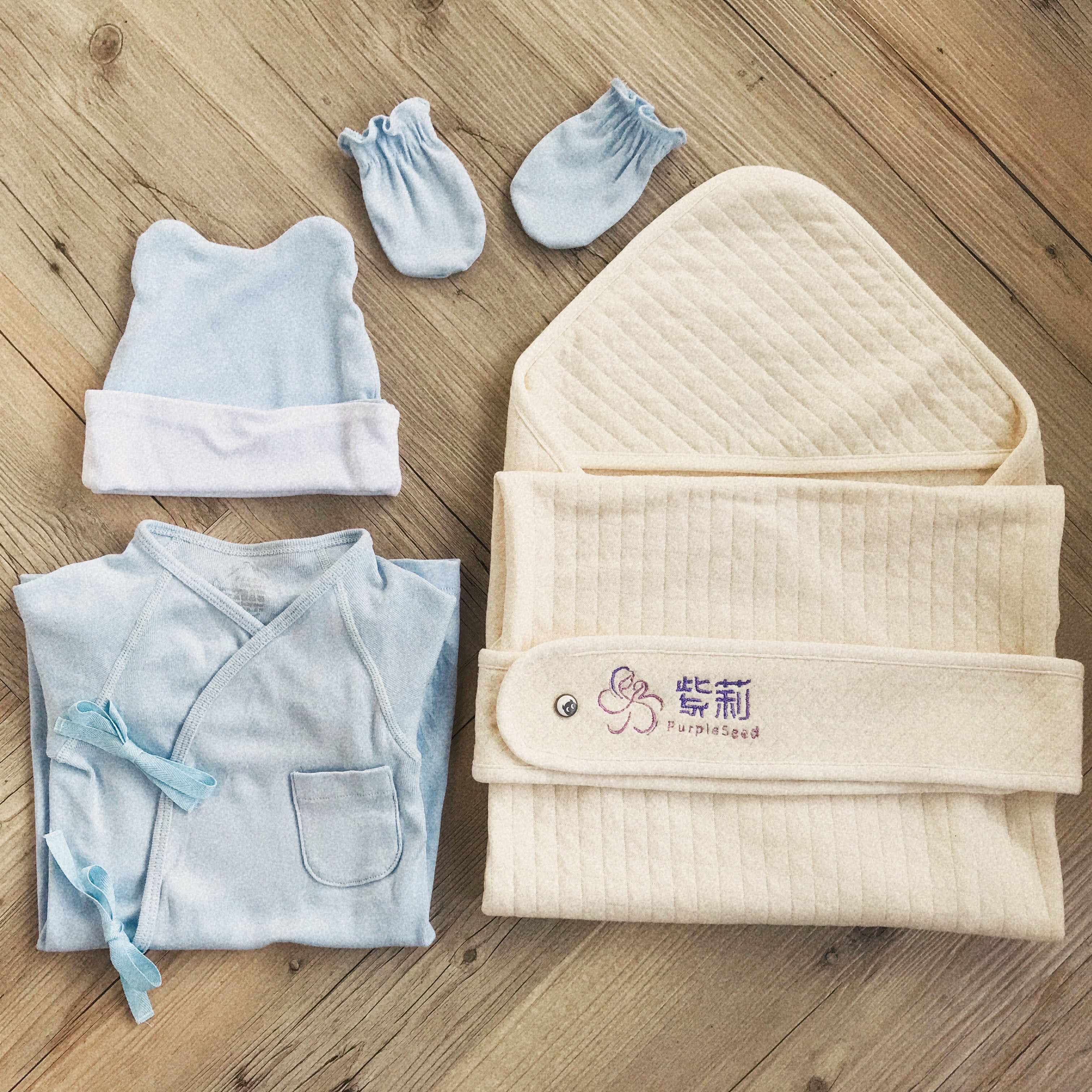 內含寶寶衣服、帽子、小手套與包巾